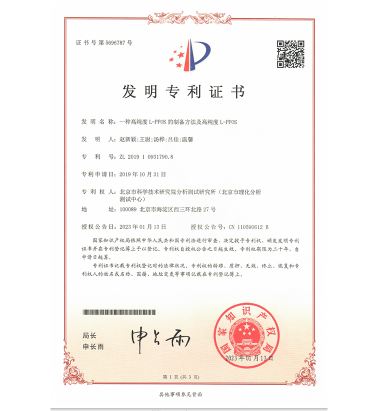 北京市科学技术研究院分析测试研究所材料化学部依托国家重点研发计划子课题“环境、消费品监控用污染物与限用物标准物质研制”的相关工作,以分析测试所为第一发明单位申请获得中国发明专利授权一项,发明名称为《一种高纯度L-PFOS的制备方法及高纯度L-PFOS》(专利号ZL 2019 1 0931790.8)。
