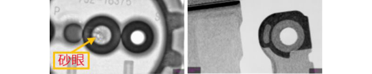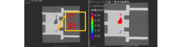 图11为树脂插头的断面图像(左图)和缺陷分析结果(右图)*1。如果空洞作为缺陷,红色代表大尺寸,蓝色代表小尺寸。
