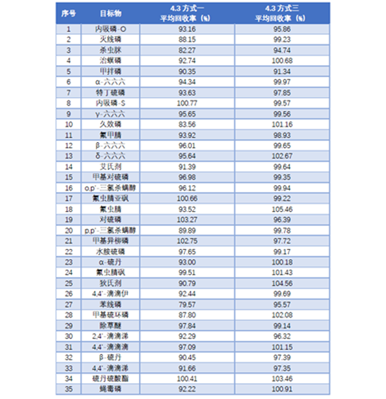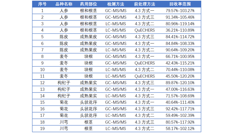 从回收率角度,人参分别使用“4.3方式一”和“4.3方式三”进行前处理,使用气质联用法检测,基质加标回收率均能满足药典要求(70%-120%),但以“4.3方式三”进行前处理,绝大部分化合物获得回收率高于“4.3方式一”。