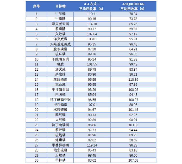 从回收率角度,人参使用“4.3方式二”和“4.2 QuECHERS”进行前处理,使用液质联用法检测,“4.3方式二”基质加标回收率均能满足药典要求(70%-120%)。但采用“4.2 QuECHERS”前处理方式,有4个化合物回收率低于70%,其中杀虫脒低于40%,可能与硅胶吸附了部分农药有关。从回收率角度,使用液质联用法检测禁用农药残留量时,人参品种使用“4.3方式二”进行前处理更加合适。