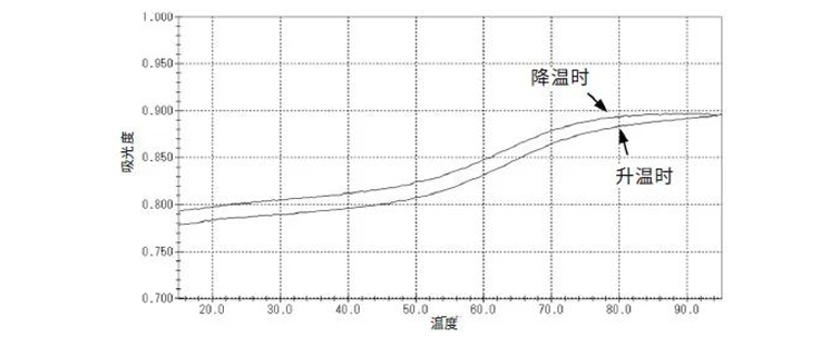 因为核酸类物质在260 nm附近有一个紫外吸收峰,吸收值在解链过程中增加,通过测试该吸光度变化,以确定Tm值。因此在进行核酸药物Tm值分析时,可以利用紫外分光光度计加上控温附件和对应的数据分析软件来完成。