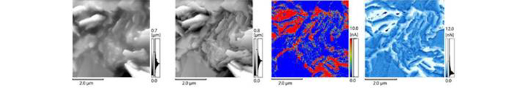 而且在扫描技术下,除了可以同时获取表面形貌图像,还可以获得多种互不影响的表面属性分布。在对石墨电极进行测试时,可设定同时获得表面形貌图像,表面电流分布图像和表面力学属性分布。
