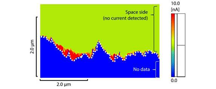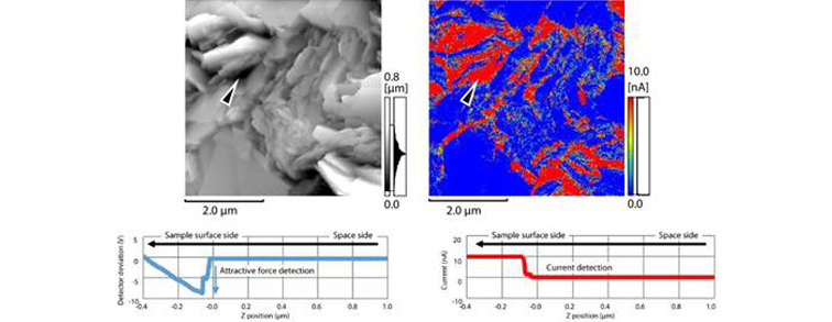 用ZXY扫描技术同时获取石墨负极表面形貌图像和表面电流分布图像如下。左图为表面形貌图像,可清晰观察到石墨的鳞片状结构,右侧的表面电流分布图像可观察到同一区域的接触电流分布。在表面形貌图像中,可以观察到表面上分布着不规则的高约1.5 μm 的鳞片石墨。在以往的接触模式下,如果样品的表面起伏超过1μm,就很难测量电流,但使用ZXY扫描技术可以进行高分辨的观测。
