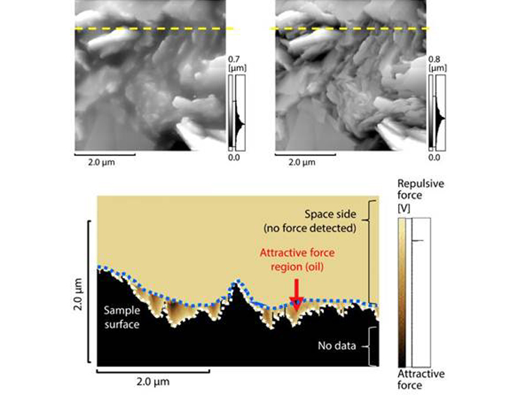 从上图中可见,底部的黑色区域为样品的固体,白色虚线为表面形貌图(探针到达设定斥力的形貌面)的剖面线,也是石墨的真实表面。而蓝色虚线为表面形貌图(探针最初检测到力的形貌面)的剖面线。白色虚线和蓝色虚线中间区域内,探针检测到的力为吸引力,可判断产生的原因是样品表面的油。因此第1张图和第2张图的差别区域就是油吸附的区域。