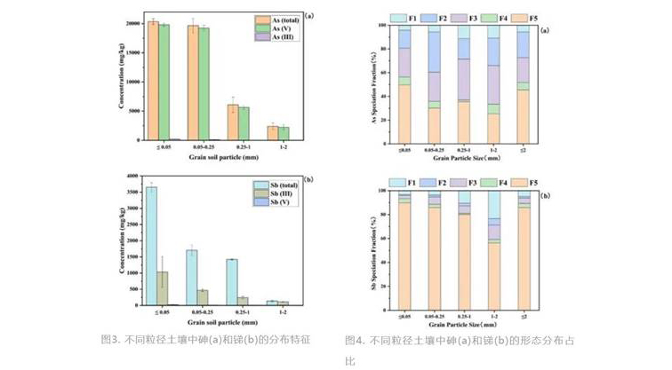 将土壤分为<0.05 mm、0.05-0.25 mm、0.25-1 mm和1-2 mm四个粒径,研究每个粒径上总As和总Sb的含量以及As(Ⅲ)、As(V)、Sb(III)和Sb(V)的分布,同时结合Tessier五步提取法对As和Sb的形态污染情况进行研究。分别使用岛津ICP-OES和HPLC-ICP-MS联用系统,建立了测定砷与锑的分析方法。分析方法各标准曲线的相关系数 r>0.9999,As(Ⅲ)和As(V)出峰时间约在2.4 min和4.95 min,Sb(III)和Sb(V)出峰时间约在3.55 min和1.65 min。各方法可分别方便准确的测定土壤中总砷和总锑、形态砷和形态锑,以及As(Ⅲ)、As(V)、Sb(III)、Sb(V)的含量,测定结果见下图。