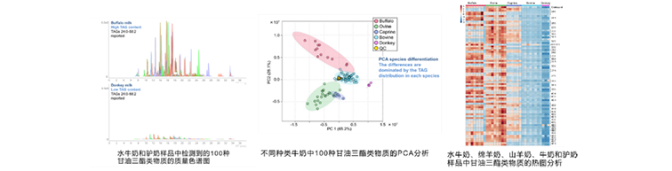 采用岛津高分辨产品LCMS-9030对牛奶、水牛奶、山羊奶、绵羊奶和驴奶等5种动物奶的脂质组分进行了分析,脂质组分也是决定各种奶口感和商业价格的主要因素之一,实验结果表明甘油三酯类物质在各种奶的脂质成分中占主导地位,且在不同动物奶之间的分布和强度存在显著差异。