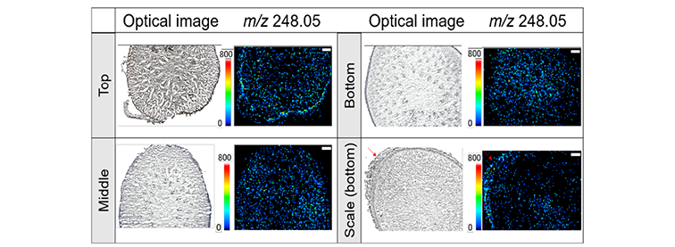 成像质谱显微镜通过测定农产品中特定分子或异物的含量并观察其分布状况,为促进安全、高品质的食品开发、优良农产品品种的开发提供帮助;在使用显微镜获得目标组织的光学图像后可直接进行质谱分析检测相关物质并确认其位置信息,可应用于农产品中特征营养成分、功能性成分等各种成分的分析,也可应用于品质鉴别、产地溯源等方面。