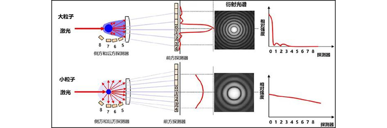 单色光束照射到颗粒后即发生散射现象,由于散射光的能量分布与颗粒的大小有关,通过测量散射光的能量分布(散射角),依据米氏散射理论和弗朗霍夫近似理论,即可计算出颗粒的粒度分布。