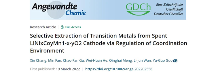 中科院化学所郭玉国教授和孟庆海助理研究员等人基于过渡金属化合物在低共熔溶剂(DESs)中的不同行为,通过使用精心设计的基于配位环境调节的串联浸出和分离体系,从不同成分的废旧LiNixCoyMn1-x-yO2(NCM)正极中选择性和高效的回收了镍、钴、锰。
