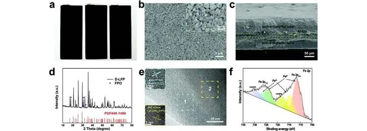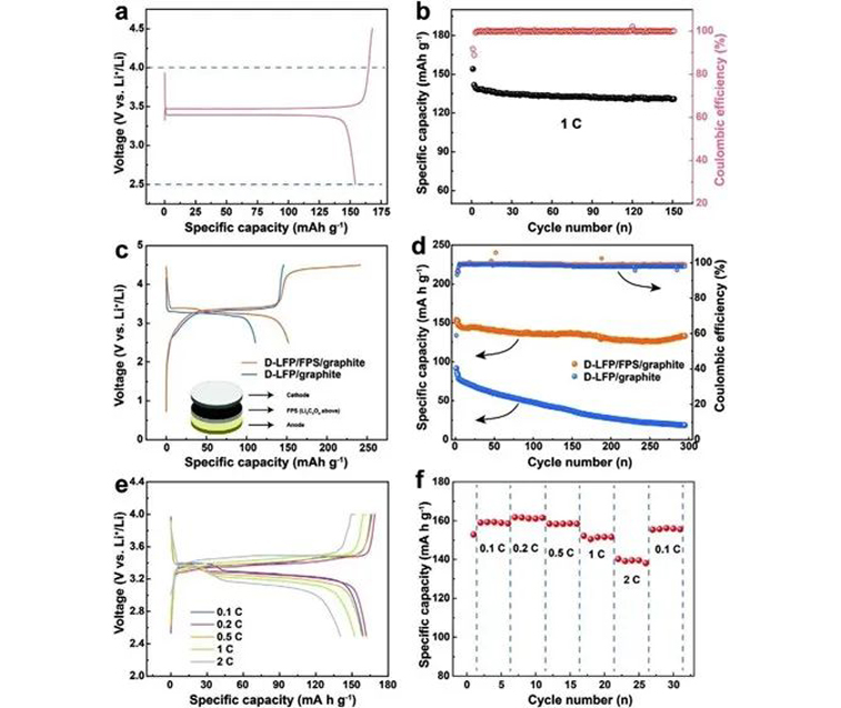 其具体的机理为:Li2C2O4在FPS上的不可逆电化学分解提供了额外的Li+来弥补初始循环中缺乏锂的LFP。从这个意义上说,废旧LFP电极可以通过原位电化学缓解过程直接再生。与目前的废旧LIBs回收方法,特别是低成本的LFP正极回收方法相比,本文基于FPS的策略将废旧LFP电极的再生与新电池的组装相结合,节省了将活性材料分离和再制造正极电极的步骤。这种新颖、简单、成本效益高的策略为直接再生废旧的LFP电池开辟了一条新的途径,并拓宽了整个LIBs回收的视野。相关论文以“In Situ Electrochemical Regeneration of Degraded LiFePO4 Electrode with Functionalized Prelithiation Separator”为题发表在Adv. Energy Mater.。
