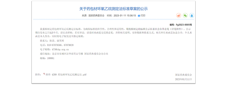 2023年1月,国家药典委员会发布了4209《药包材环氧乙烷测定法》公示稿,用于检测经过环氧乙烷灭菌的预灌封注射器组合件、滴眼剂瓶等药品包装材料中环氧乙烷残留量。