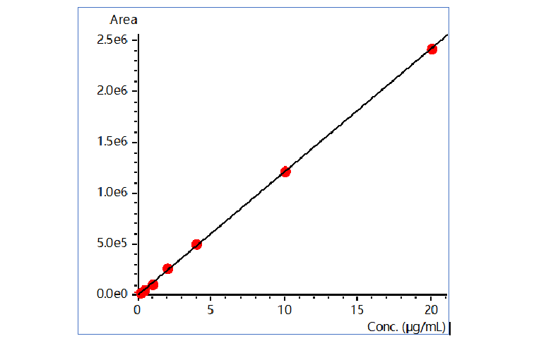 GCMS法具有更高的灵敏度,环氧乙烷标准曲线浓度范围为0.2 ~ 20 μg/mL,标准曲线如下图,线性相关系数R为0.9999,线性关系良好。