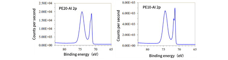 图3清晰地显示了较小的通能(10eV)时,能看到单质态Al 2p出现明显的双峰劈裂,但是灵敏度相对较低(大致在7×103cps),而在较大的通能(20eV)时,单质态Al 2p的双峰劈裂几乎消失了,但是灵敏度显著提高(大致在2×104cps)。