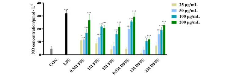 6种海带来源褐藻多糖硫酸酯对巨噬细胞NO表达的影响。LPS (1 μg/mL)处理组作为阳性对照