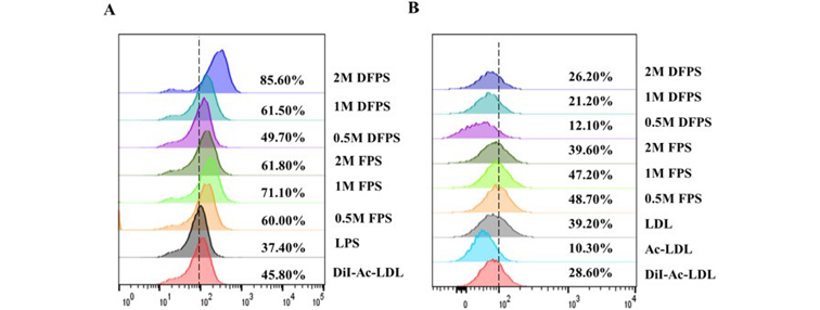 流式细胞术检测6种海带来源褐藻多糖硫酸酯吞噬Ac-LDL的能力 (A)和与DiI-Ac-LDL竞争结合SR-A的能力 (B)