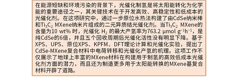 CdSe(硒化镉)因其合适的带隙、在可见光区的强吸收和高化学稳定性而备受关注,然而由于光生载流子的快速复合,单独使用CdSe的产氢性能仍然不能令人满意。Ti3C2 MXene作为一种新型二维材料,具有独特的结构以及良好的物理化学性能,与合适的窄禁带半导体复合可以获得可见光催化活性并促进光生载流子的分离。