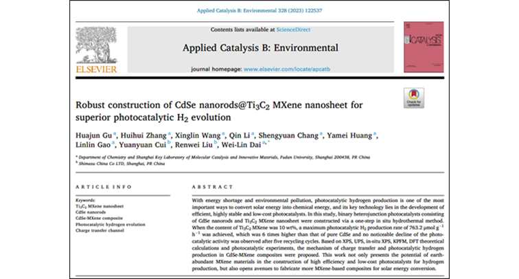 基于此,复旦大学戴维林教授课题组设计了一种CdSe纳米棒@Ti3C2 MXene纳米片复合光催化剂,并结合SPM(扫描探针显微镜)及原位光照XPS(X射线光电子能谱)结果进行相关机理探讨,为进一步开发高效稳定的光催化体系提供了研究思路。岛津分析中心参与该项研究工作,相关合作成果发表于光催化领域国际知名SCI期刊《Applied Catalysis B: Environmental》(IF=24.3)上。