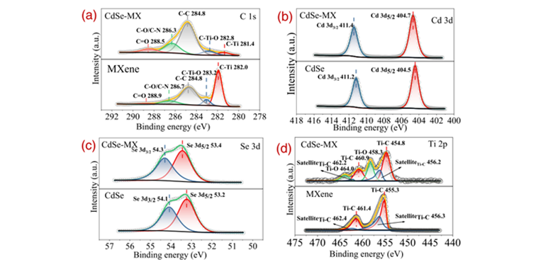 图5. CdSe-MX复合材料与纯CdSe的(a) C 1s、(b) Cd 3d、(c) Se 3d、(d) Ti 2p 高分辨率XPS谱图