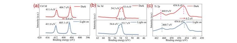 由于真实反应体系在光照下进行,故进一步采用原位光照XPS用于探索CdSe和Ti3C2 MXene之间的电荷转移,结果见下图7。与黑暗条件相比,Cd 3d的结合能在光照射下正向移动0.4 eV,Se 3d 峰的结合能在光照条件下也正向移动0.3 eV。同时,Ti 2p 峰的结合能在可见光照射下负向移动0.2 eV。这一发现证明了在原位光照条件下,电子进一步从CdSe转移到MXene。