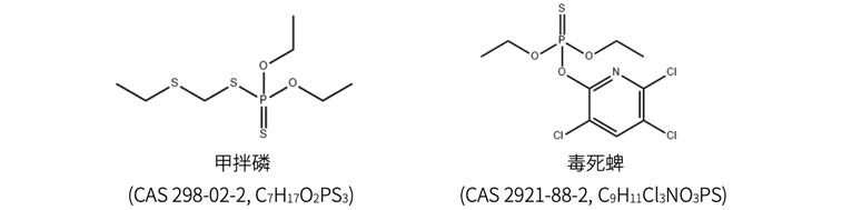 有机磷农药具有神经毒性,通过与胆碱酯酶结合,形成磷酰化胆碱酯酶,抑制胆碱酯酶活性,使胆碱酯酶失去催化乙酰胆碱水解作用,积聚的乙酰胆碱进而引起神经毒性。有机磷见光易分解、受热不稳定、在碱性条件下更是会迅速降解,目前常用的有机磷农药主要有乐果、敌敌畏、甲拌磷、毒死蜱、甲基对硫磷等。