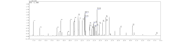 1、萘-d8(内标)2、敌敌畏3、(E)-速灭磷4、(Z)-速灭磷5、苊-d10(内标)6、内吸磷7、灭线磷8、治螟磷9、甲拌磷10、特丁硫磷11、二嗪磷12、地虫硫磷13、异稻瘟净14、(E)-磷胺15、菲-d10(内标)16、氯唑磷17、乐果18、甲基毒死蜱19、(Z)-磷胺20、甲基对硫磷21、毒死蜱22、马拉硫磷23、杀螟硫磷24、对硫磷25、甲基异柳磷26、溴硫磷27、水胺硫磷28、稻丰散29、苯线磷30、丙溴磷31、三唑磷32、?-d12(内标)33、蝇毒磷