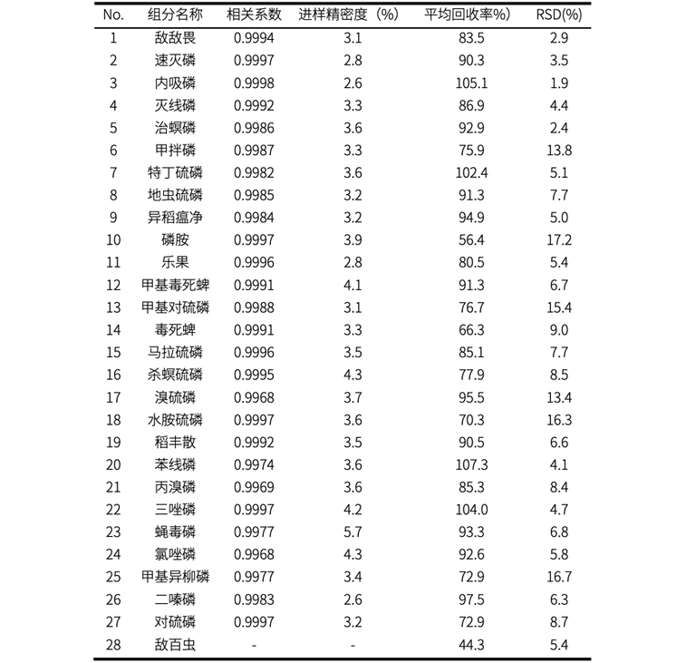 表1. 28种有机磷农药方法学考察结果