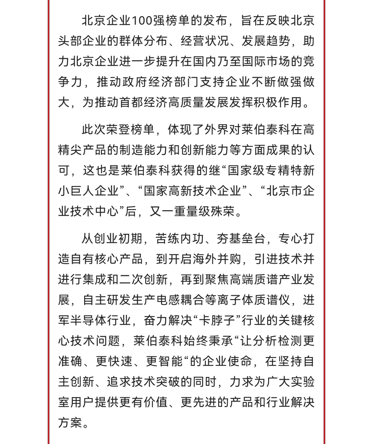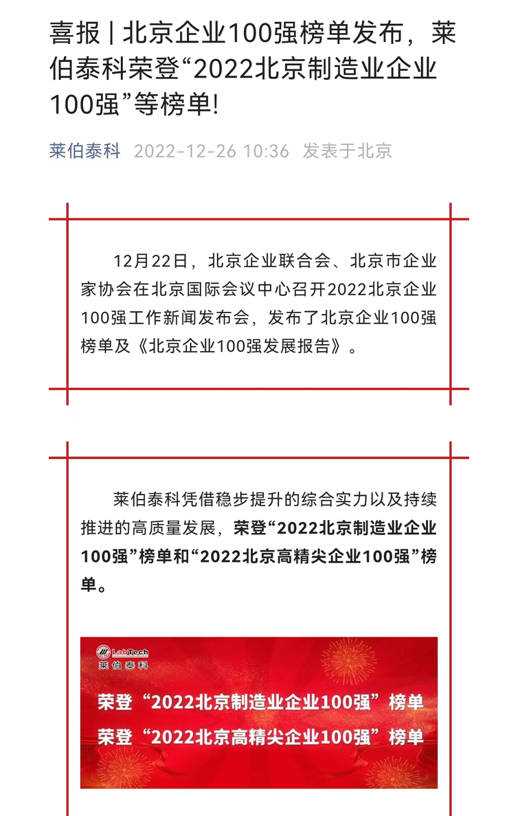 喜报 | 北京企业100强榜单发表,莱伯泰科荣登“2022北京制造业企业100强”等榜单!