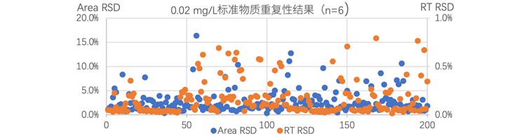 对0.02 mg/L混合标准溶液连续分析6次,计算重复性。结果见图2,保留时间RSD为0.01%~0.79%,除5个化合物外其余化合物峰面积RSD<10%,重复性良好。