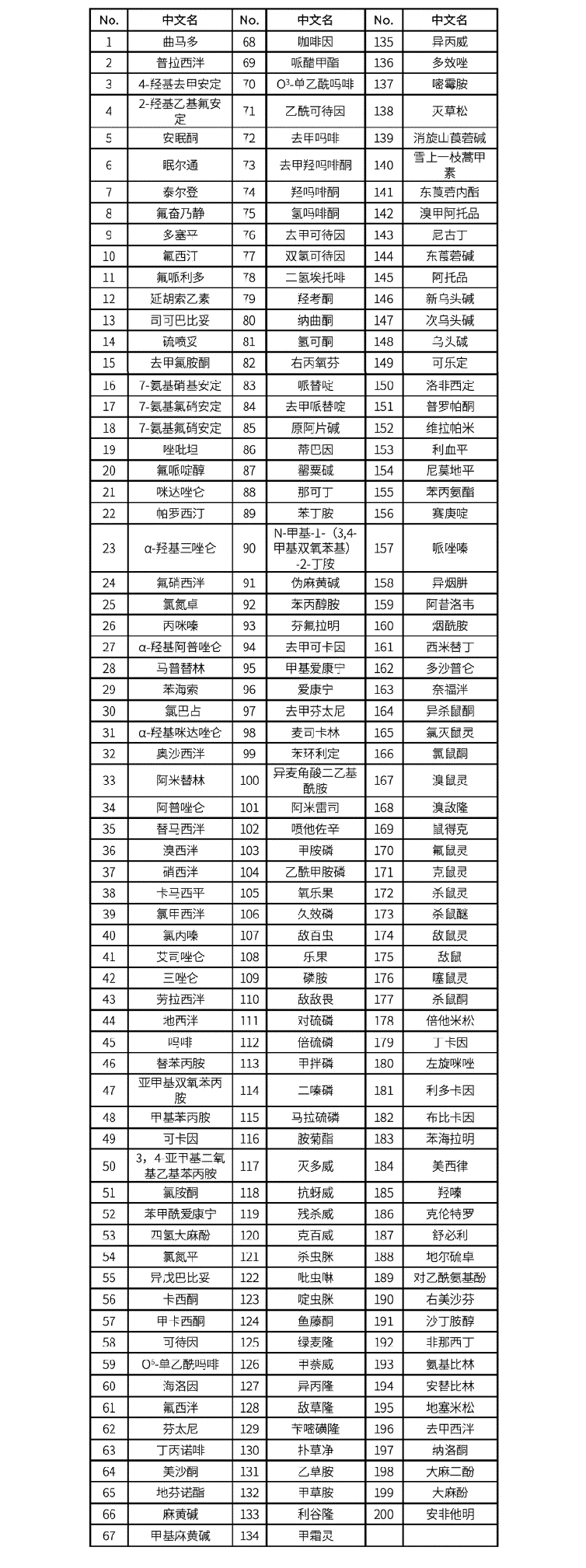 表1. 200种毒品毒物化合物清单(上下滑动查看)