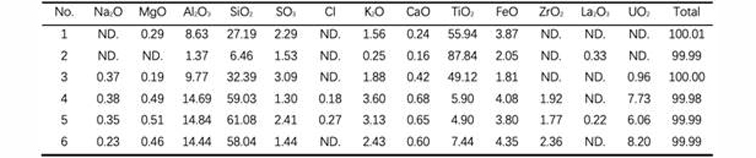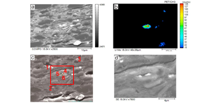 图中,a为背散射图像,b为对应位置的元素铀(U)分布特征,c为此位置的二次电子图像,d为c图中红色方框位置进一步放大后的微观图像特征。此类型煤中元素铀(U)的面扫描结果和表1 的成分结果显示,U主要赋存在锐钛矿或者金红石、钛铁矿中。与粘土矿物伴生的铀钛矿中的粒度很小,大概 1 μm 左右,粘土矿物本身的颗粒也极为细小,具有可能放射性污染的U元素通过常规洗选很难完全脱除。