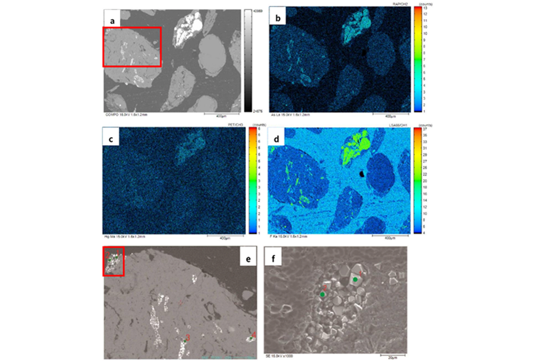 图中,a、b、c、d为面分析测试位置的背散射图像和对应的元素分布特征图像,e为图a中红色方框进一步放大后的图像,f为图e中红色方框位置放大后的微观图像特征。