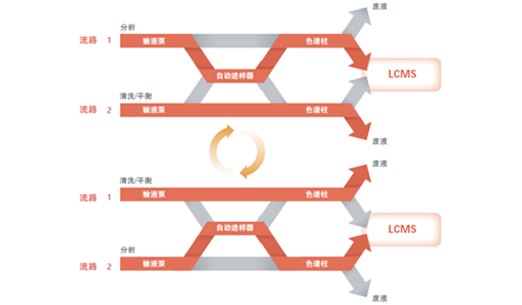 常规LC/MS在两次样品分析之间,存在系统冲洗、色谱柱平衡、自动进样器进样等一系列步骤,这些时间因没有任何有效数据的采集而白白浪费。