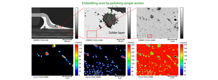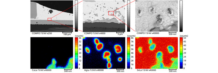 岛津研发部门使用EPMA-8050G仪器在低加速电压(7kV)条件下对电子元件和印刷电路板连接处的焊料层进行了背散射(BSE)和元素面分布分析,图2 展示了微米尺度(刻度尺5μm)上杂质元素以点状Ag颗粒沉积为主,少量Cu颗粒沉积,确定了杂质元素的种类。