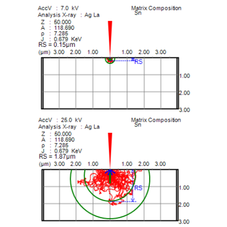 图5. 不同加速电压条件下电子束作用范围(红色)和X射线出射深度(绿色)