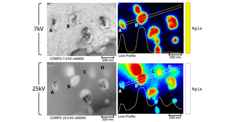 图4. 不同加速电压(7kV和25kV)条件下背散射和Ag元素分布图像