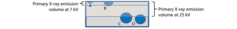 使用高加速电压(25kV)条件对相同视域进行分析,图4 展示Ag颗粒在高加速电压条件下具有更广的分布范围(C、D点区域均有Ag颗粒分布),结合岛津的电子传播路径显示程序(Electron penetration display program)分析,图5 展示高加速电压条件下X射线出射深度更大,根据以上信息可模拟推断出Ag杂质颗粒在焊料层纵向上的分布(图6)。