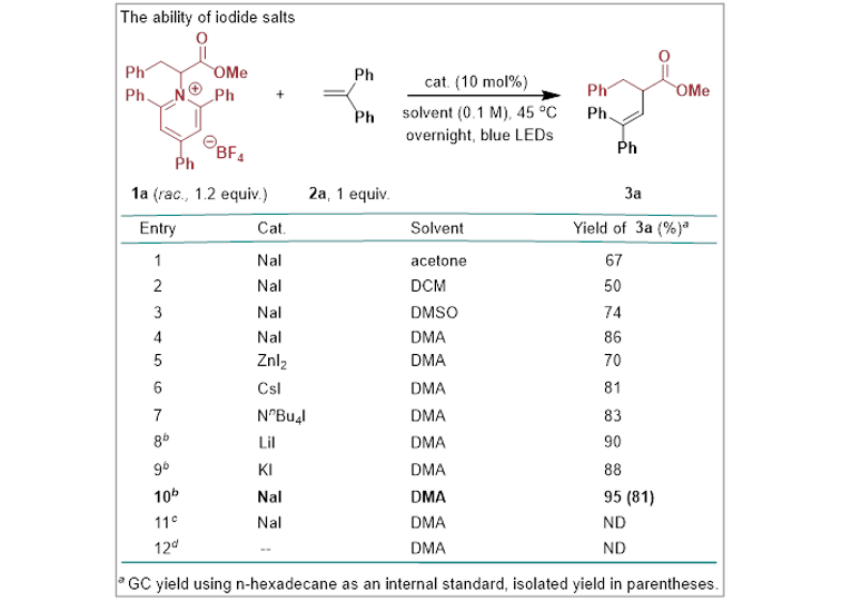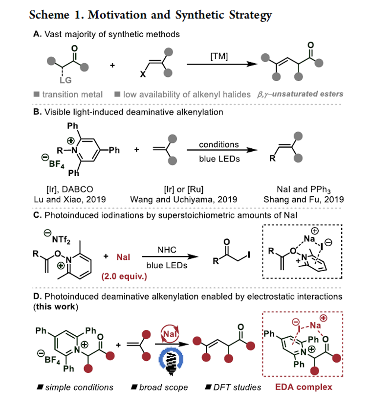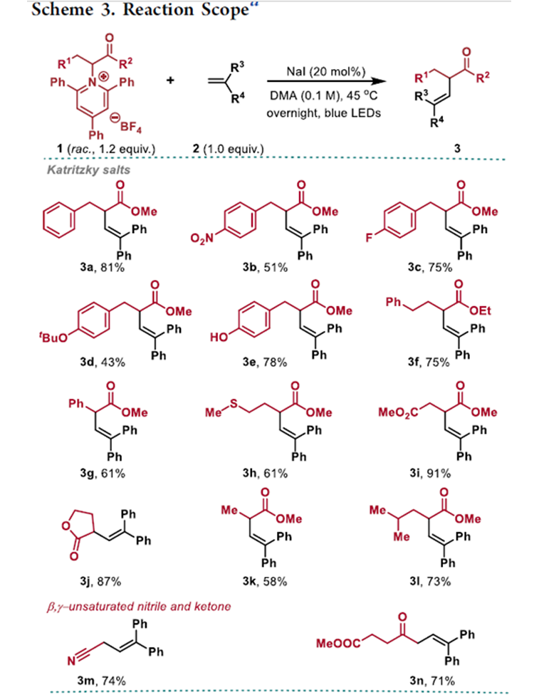 可见光促进的脱氨烷基化反应已经成为一个化学合成的重要研究方向,从廉价易得的原料出发合成羰基化合物是现代合成科学的重要目标,而β,γ-不饱和羰基化合物因其独特的活性特征,日益成为有价值的合成砌块。传统方法合成β,γ-不饱和羰基多建立在过渡金属催化的交叉偶联反应,如钯、镍或铜催化下的烯醇和烯基卤代物、烯基磺酸化合物等反应(图1A)。近年来,可见光促进的脱氨烷基化反应已经成为多样化烯烃制备的重要手段(图1B), 而利用弱相互作用EDA形成的策略,该课题组发现仅仅通过碱金属盐(例如,NaI, NaOAc, K2CO3等)便可以与N-羟基邻苯二甲酰亚胺酯(NHPI esters)以及系列吡啶盐等形成EDA复合物(图1C)。据此,作者推测仅仅通过碘化钠和Katritzky盐就可以直接形成EDA复合物,产生的烷基自由基与双键偶联,再生成相应的产物(图1D)。通过可见光促进EDA复合物引发的Katritzky盐与烯烃的脱氨基烷基化反应,成功实现了β,γ-不饱和酯类化合物的构建,该方法原料简单、条件温和,无需过渡金属催化和额外的添加剂,具有通用性。