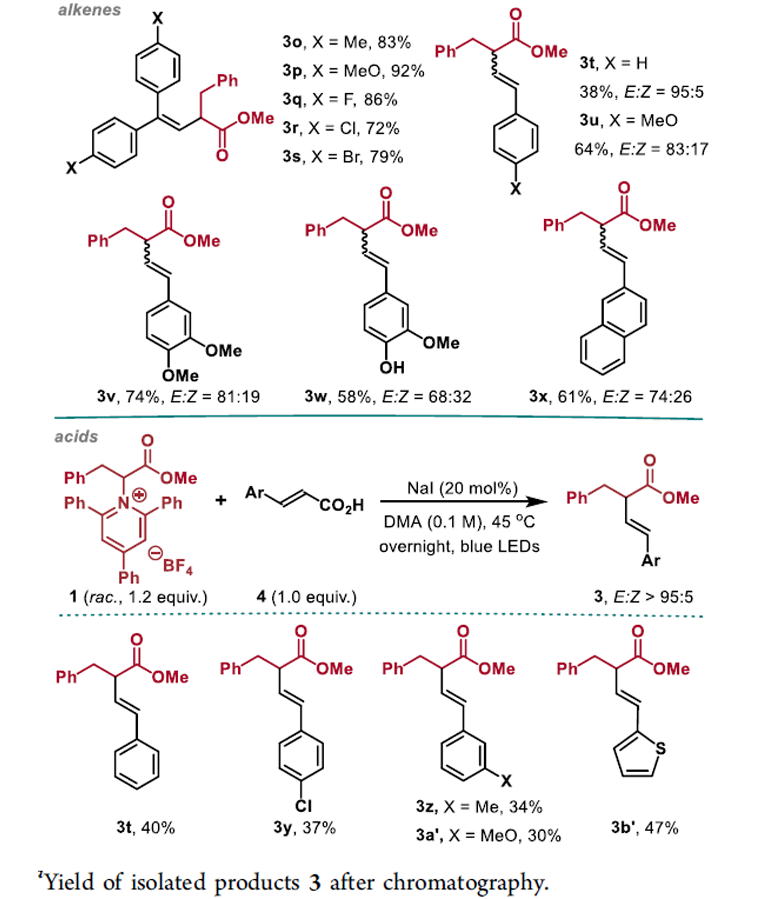 随后,作者对于底物的适用性进行了扩展,对于系列苯丙氨酸衍生的含吸电子基或者供电子基的吡啶盐(3a-g)均可以顺利反应。此外,该方法可耐受多种官能团(3h-n)(图4)。同时,二苯乙烯上取代基的影响(3o-s)也被一并考虑,亦具有较好的结果;苯乙烯(3t)的反应也得到了相应的β,γ-不饱和产物,尽管产率有所降低,其具有很好的E/Z比率,取代的苯乙烯(3u-x)也得到相应的产物,但是E/Z比率出现降低。该方法也适用于肉桂酸(3t)为原料和吡啶盐的反应,各种取代肉桂酸(3y-b’)也容易发生反应,可以得到高E/Z比例的β,γ-不饱和酯(图5)。