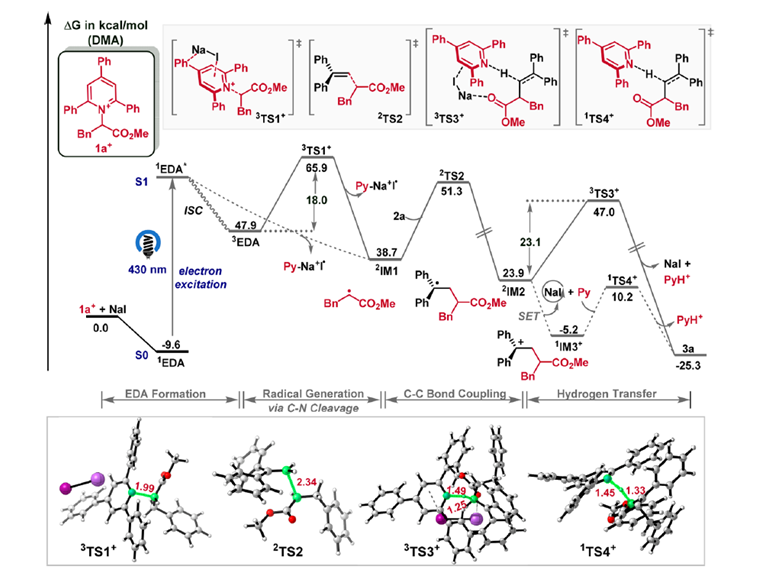 本研究开发了一种更为简单的合成β,γ-不饱和羰基化合物的方法,只需要NaI和Katritzky盐即可实现。DFT计算研究表明二者间的弱相互作用力加速催化EDA的产生,并揭示了自由基反应的机理。该反应从廉价易得的原料出发,不使用过渡金属催化剂和任何添加剂,操作性强,通用性良好。
