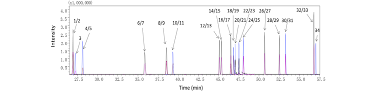 二噁英很难自然降解,容易渗透到人类和动物的食物中。针对食品和动物饲料中的二噁英的检测,相比于单四极杆的GCMS,气相色谱三重四极杆气质联用仪(GCMSMS)具有更高的灵敏度及选择性,因此可以检测食品中更为痕量的二噁英。岛津的GCMSMS可以通过MRM自动优化工具,在一个序列中优化最佳的产物离子及碰撞能量,并将MRM的相关参数自动注册到Smart MRM数据库,建立MRM的仪器方法。