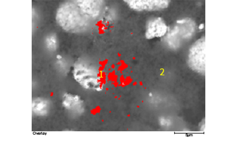 为了更为直观的显示Fe元素富集位置,将Fe元素面分布图与背散射电子像进行叠加显示,如图3所示。图3中红色标记区域即为Fe元素富集位置。