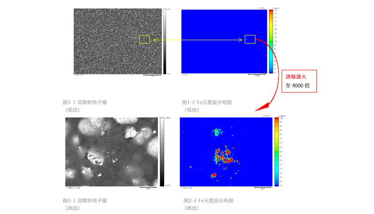 电池极片中常见混入的金属异物有Fe、Cu、Zn、Al、Sn、不锈钢等,以含Fe异物为例,为排查某正极极片中是否混入含Fe金属异物,首先在视场1.0×0.8mm下进行Fe元素的低倍大区域面扫描(岛津电子探针最大扫描范围可高达90×90mm),结果见图1。图1-2中黄色方框标示处,明显可见有Fe元素的富集;为进一步清晰显示异常富集情形,对图1黄色方框逐级放大至4000倍。如图2所示。