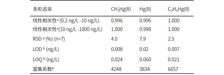 注:a:样品量为5mL。RSD是基于多次测量0.5 ng L-1的二价汞和烷基汞得到的相对标准偏差。