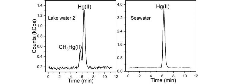 进一步对海水、河水和湖水中的二价汞和烷基汞进行了分析,以验证在线固相萃取富集检测方法的可行性和准确性,见下图。结果表明Hg(II)是这些天然水中主要形态的汞,其浓度为0.46至1.30 ng/L。在湖水中,也检测到超痕量的CH3Hg(II),为0.07 ng/L。