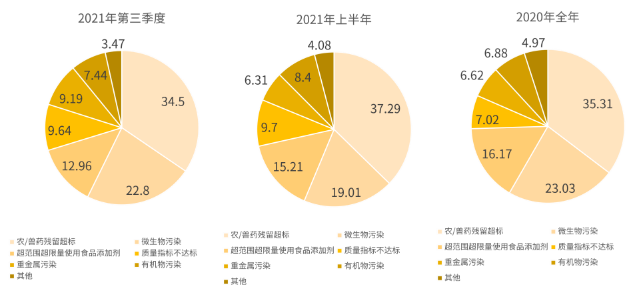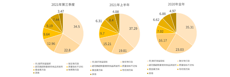 每年国家市场监督管理总局均出台相应的食品安全监督抽检实施细则,对食品安全进行监督抽查,排查和防范食品安全风险隐患从而保障食品的安全。从近年来我国食品安全监督抽检的结果看,食品安全整体状况良好,2020年和2021年前三季度整体合格率在97%以上。食品中检出的不合格项目类别主要有农/兽药残留超标、微生物污染、超范围超限量使用食品添加剂,质量指标不达标、有机物污染、重金属污染等(具体占比见下图,数据来源:国家市场监督管理总局官网)。