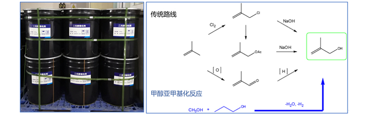 图2. 1,3-丁二醇工业催化剂研制及甲醇直接α-亚甲基化路线对比