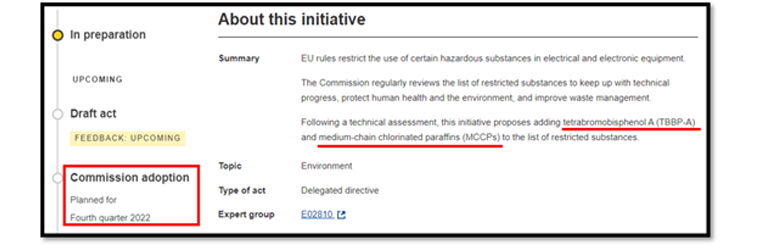 2022年5月20日,欧盟委员会在其官网公开了一项RoHS相关提案程序(initiative),该提案建议将四溴双酚A(TBBP-A)和中链氯化石蜡(MCCPs)加入限制物质清单中。