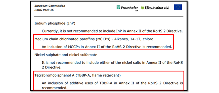 此前,在2021年3月,欧盟RoHS指令评估支持和技术支援研究机构Oeko Institute曾发布咨询项目Pack 15最终评估报告,最终确定考虑拟将中链氯化石蜡(MCCPs)和四溴双酚A(TBBP-A)纳入RoHS的附录II限制物质清单中。