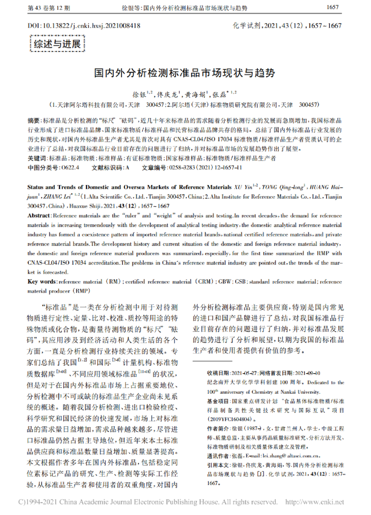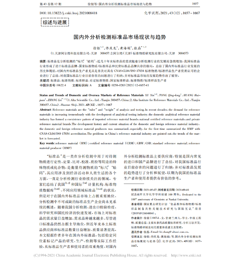 阿尔塔科技技术团队撰写的综述文章《国内外分析检测标准品市场现状与趋势》正式刊发在《化学试剂》期刊2021年43卷12期。自中国知网2021年9月10日网路首发至今,下载量已达173次,深受业内人士欢迎。