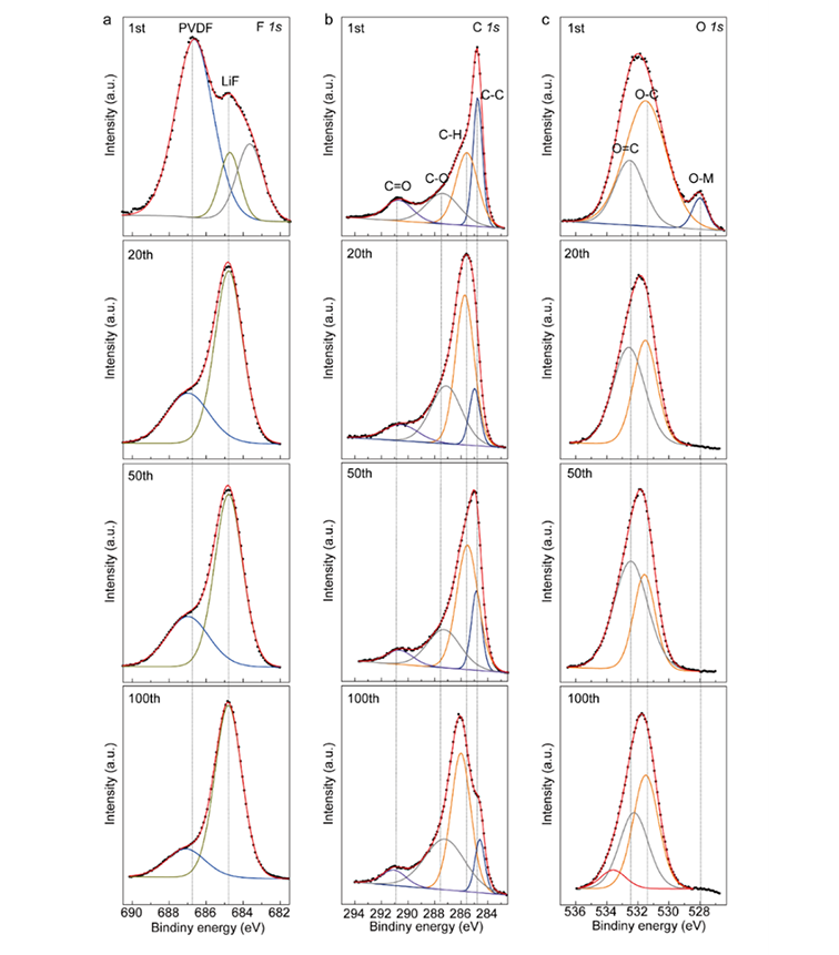 图2. XPS测试分析电池循环中单晶高镍正极材料表面CEI的组成演化。